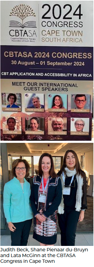 My deep thanks to Drs. Shane Pienaar du-Bruyn, Director of CBTASA, Daniel Rabinowitz, Jaco Rossouw, and other colleagues from the CBTASA for planning such a successful congress and for inviting me to speak and train. I very much enjoyed my first visit to South Africa, where I also had the opportunity, before the Congress, to visit two NGOs (Happy Feet and the Bridges for Music) addressing Mental Health in unique ways in the Langa Township in Cape Town, and to vacation and enjoy the beauty of Africa across Botswana and South Africa.